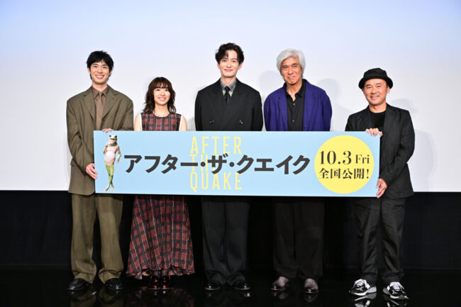 映画『アフター・ザ・クエイク』の舞台挨拶付きプレミア上映会が9月9日(火)にアトル新宿で行われ、出演者の岡田将生、鳴海唯、渡辺大知、佐藤浩市、そして井上剛監督が登壇した。