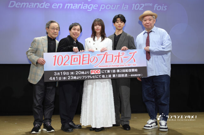 伝説のドラマ『101 回目のプロポーズ』の続編ドラマが大ヒットから35年のときを経て完成した。ドラマ『102 回目のプロポーズ』の完成披露イベントが3月19日(木) にフジテレビ本社マルチシアターにて行われ、W主演の唐田えりか、せいや(霜降り明星)、共演の伊藤健太郎、武田鉄矢、そして鈴木おさむ(企画)の5名が登壇した。