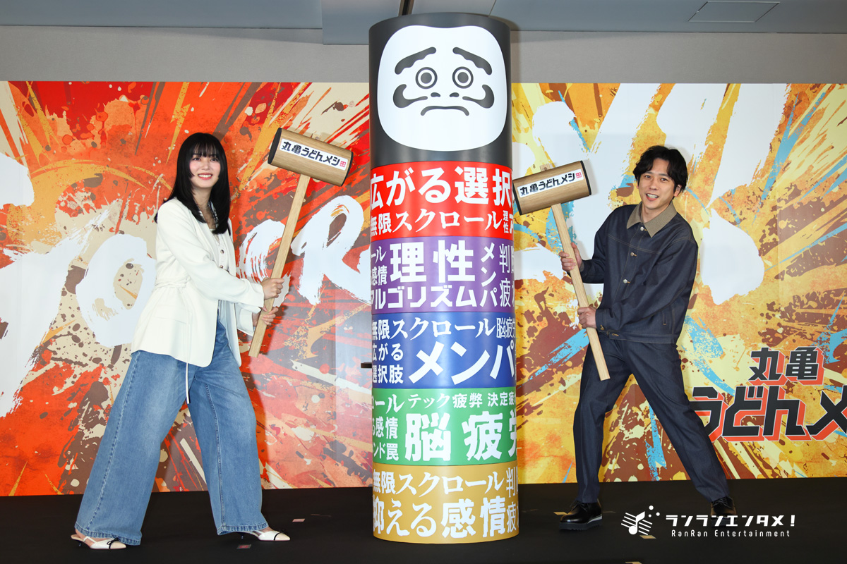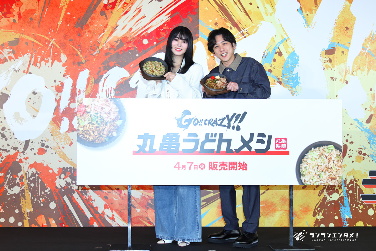丸亀製麺による『丸亀うどんメシ』新商品発表会が3月31日(火) に開催され、4月7日放映開始の新TVCMに出演した二宮和也と池田エライザが登壇した。