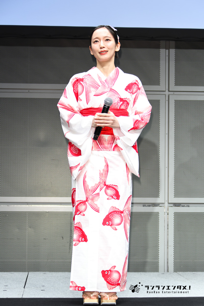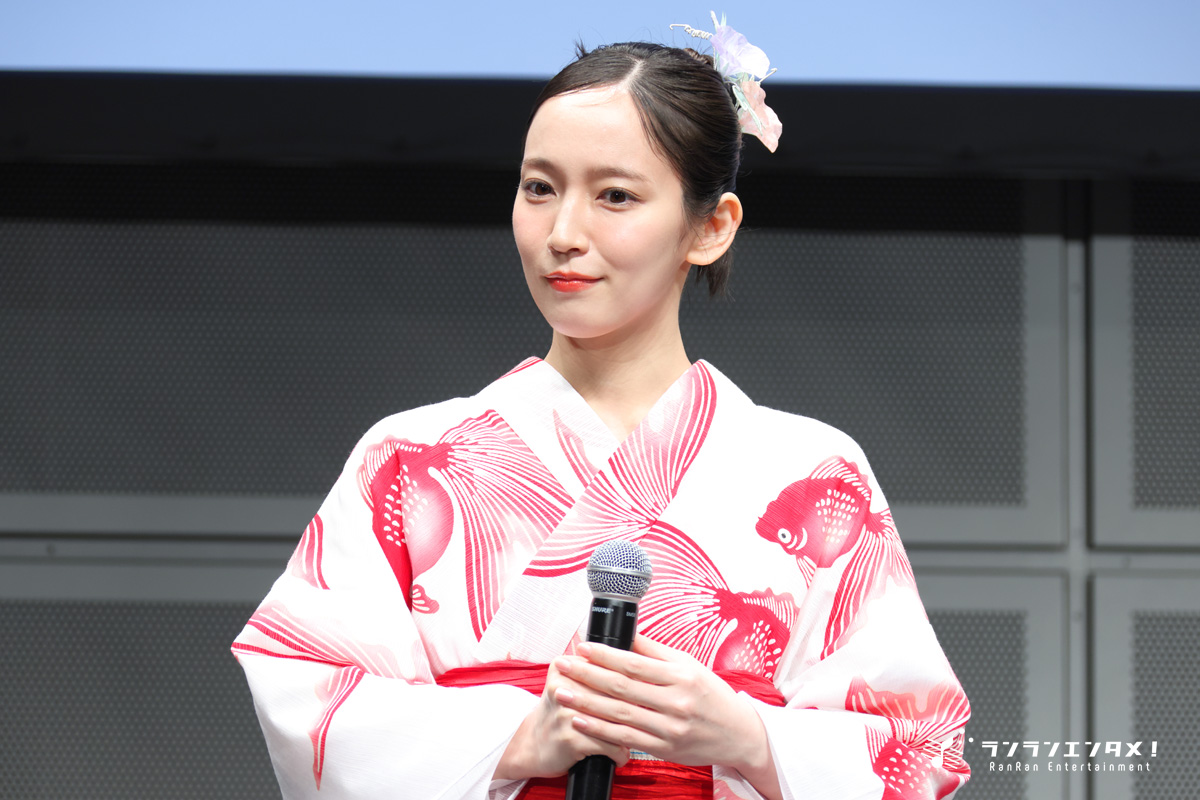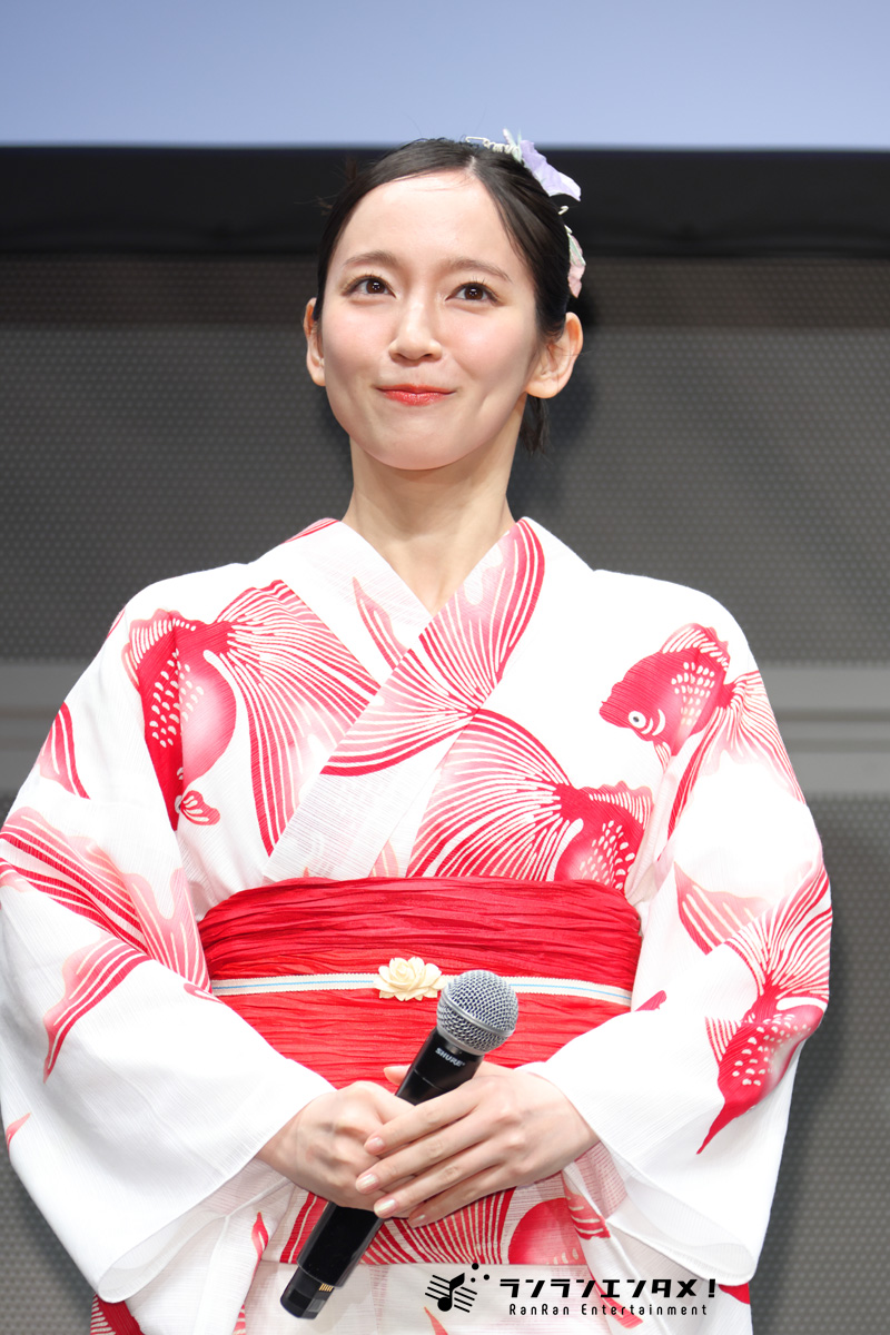 華やかな浴衣姿の吉岡は「⾒ていただいてもいいですか︖」とくるっと⼀回転し、⾦⿂がデザインされた浴⾐をお披露⽬。「TVアニメ『九⿓ジェネリックロマンス』で(⾦⿂の)サクセス役の声を担当させていただいている縁で⾦⿂柄にしてみました。そして頭には朝顔、背中にはバラが咲いて…。咲き乱れている⼈になっています」と照れながら紹介。同じく浴衣姿の水上も一回転し「涼やかではあるけれど、吉岡さんの浴⾐姿を⾒たスタイリストさんから『吉岡さんが華やかだから⽔上さんが質素に⾒える』と⾔われた。いやいやこの浴⾐、あなたが持って来たんでしょう(苦笑)、俺が悪いみたいなんですけど」と会場を笑わせた。
