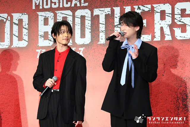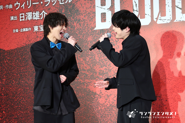 渡邉(ミッキー役):人間の心はとても複雑で、意地悪というか面白い。誰しもその時々で、これこそがいい未来につながるだろうと自分を信じて選択するけれど、うまくいかないこと、悲しいことが起こる。そういう人間の悲しい出来事は、一歩引いたところとか、自分が関係ないと思って見ると喜劇的に思えたりすることもあるんです。そういう要素が『ブラッド・ブラザーズ』にはあるなと思っています。生き別れた双子という現実ではあまり出会わないテーマではあるんだけども、人間のおかしさとか哀れさみたいなものが、とても色濃く宿されている作品だなと思っております。派手な作品をやるという意識ではなく、リアルな人間的な物語を演じさせていただくという自覚を持って、一生懸命やっていけたらと思っております。